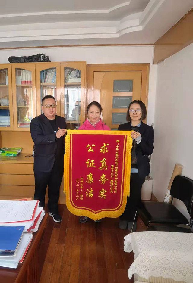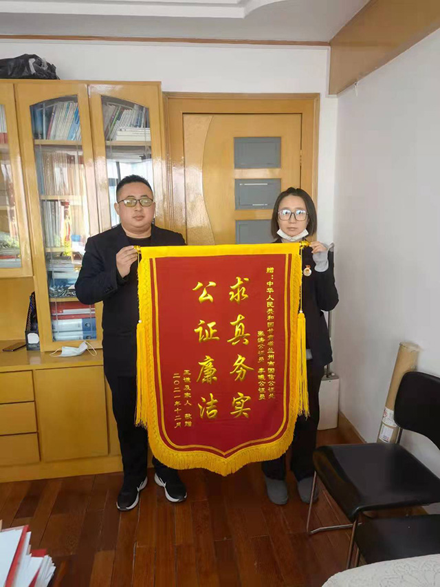 今天姓王的當(dāng)事人來到國信,對(duì)國信公證人員在這次歷史遺留房產(chǎn)問題辦理公證過程中主動(dòng)上門,加班加點(diǎn),不壓其煩,解決了她們家里的大難題,還以公益為目的,以百姓為中心,針對(duì)她們家里的困難情況,減免了部分公證費(fèi)。她的感激之情無以言表,自己主動(dòng)送一副旌旗,連著說你們國信的公證人員太好了。